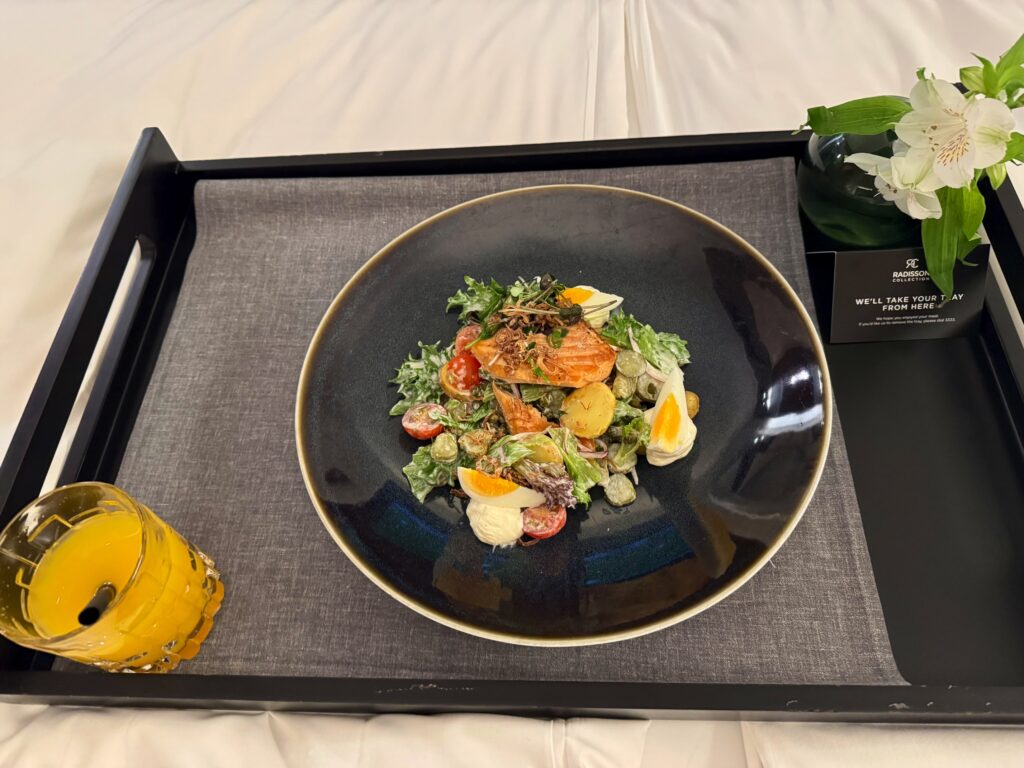 Hotellin yhteydestä löytyy myös kaksi erillistä baaria sekä ravintolat Issei ja MEKK. Viimeksi mainitun ravintolan puikoissa häärii Rene Uusmees, joka on häärinyt Tallinnan ravintolaskenessä jo useamman vuosikymmenen ajan. Joku saattaakin muistaa ravintola MEKKin siltä ajalta, kun ravintola toimi vanhassakaupugissa sijaitsevan Savoy Boutique Hotellin yhteydessä. Kymmenisen vuotta sitten Rene myös vastasi Palace Hotellin yhteydessä toimineen ravintola Konradin toiminnasta. Tällä kertaa emme lähteneet paikan päälle MEKKiin testaamaan ruokia, vaan päätimme turvautua huonepalveluun. Suoraan huoneeseen toimitettu lämminsavulohisalaatti olikin kerrassaan herkullinen.